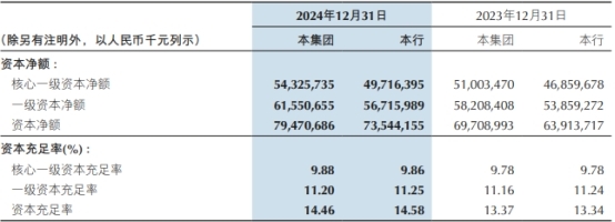 截至2024年12月31日,重庆银行核心一级资本充足率9.88%,一级资本充足率11.20%,资本充足率14.46%。核心一级资本充足率、一级资本充足率、资本充足率较上年末分别增加0.10、0.04、1.09个百分点。