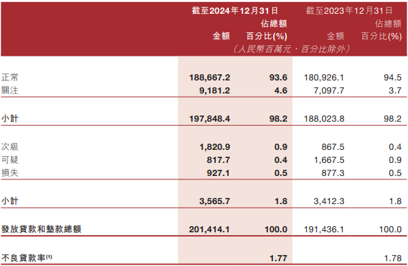 截至2024年12月31日,晋商银行不良贷款35.66亿元,较2023年12月31日增加1.53亿元;不良贷款率为1.77%,较2023年12月31日下降0.01个百分点。