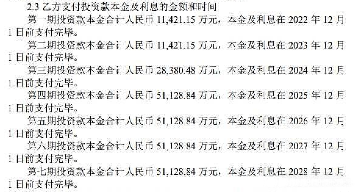 根据《临沂金正大投资控股有限公司重整投资协议之补充协议(三)》,乙方临沂民营投资基金(有限合伙)(以下简称“投资基金”)向甲方临沂金正大投资控股有限公司管理人(以下简称“管理人”)在法院裁定批准后的7年内分7期支付25.57亿元投资款及利息。